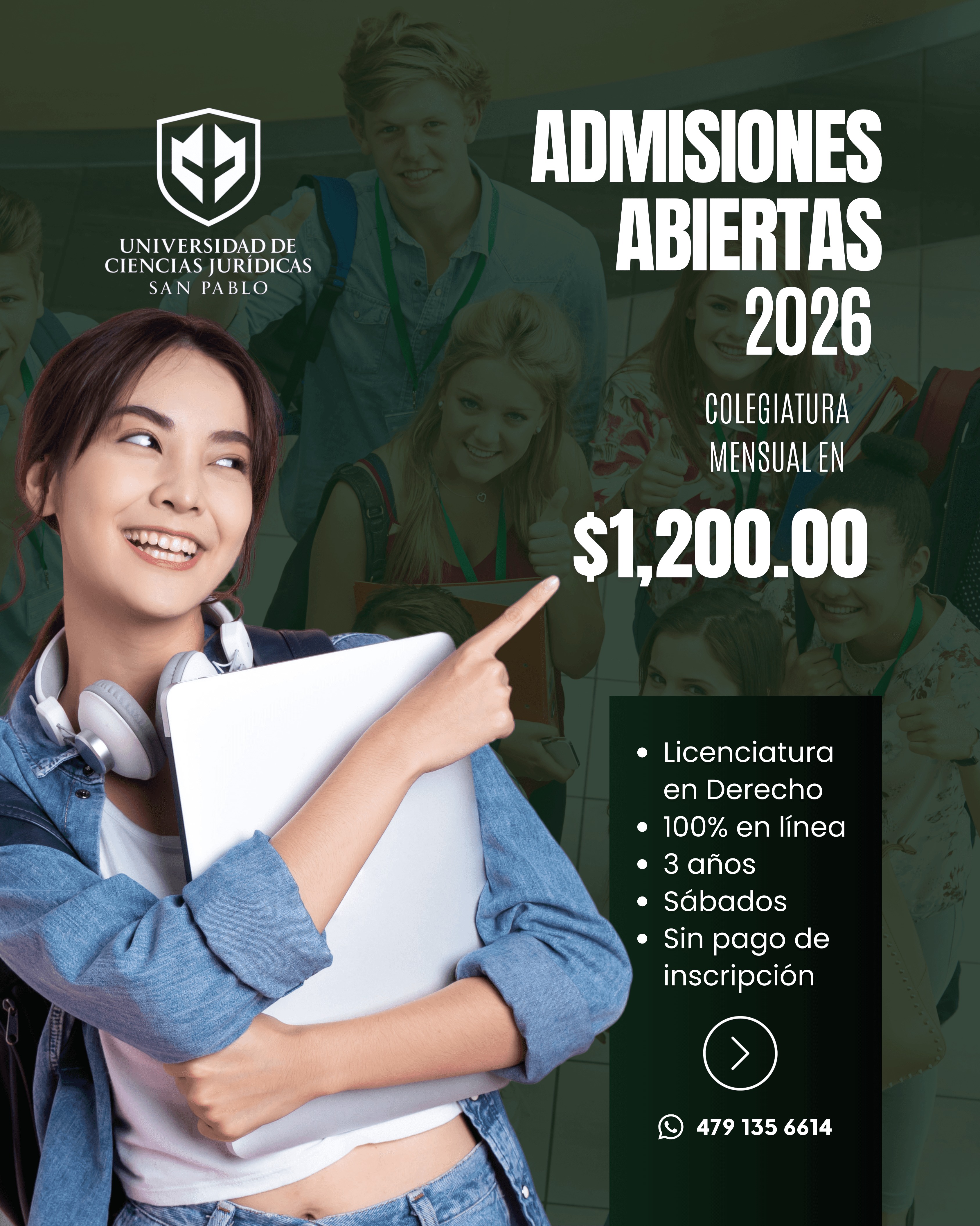 Licenciatura en Derecho con clases sabatinas, colegiatura mensual de $1,200 y sin pago de inscripción.Inscripciones abiertas – cupo limitado para el grupo de mayo 2026